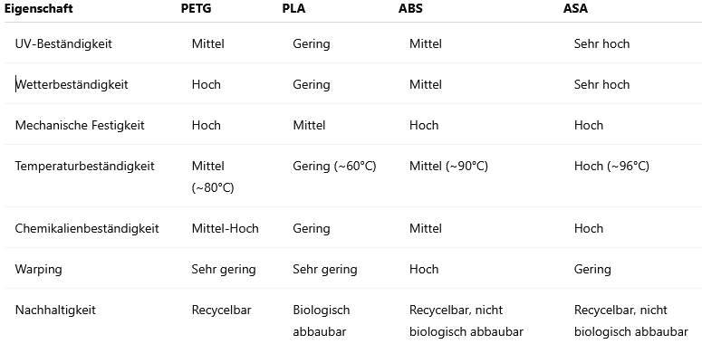 Umweltauswirkungen: PETG basiert auf fossilen Rohstoffen, gilt aber durch seine Recyclingfähigkeit als vergleichsweise nachhaltiger als ABS oder ASA.